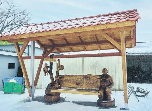 Das neue Dach schützt die kunstvoll geschnitzte Pennigbütteler Jubiläumsbank vor Schnee und Regen. Foto: pv