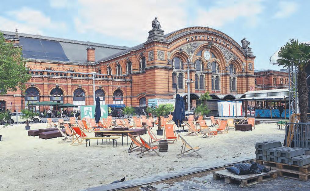 Da, wo am Wochenende zuvor noch die Beachvolleyball-Asse baggerten und schmetterten, eröffnete am Freitagnachmittag zwischen Bahnhof und Überseemusem ein urbaner Beachclub. Unter dem Titel „Summerside“ ist der Treffpunkt bei gutem Wetter bis zum 2. Juli täglich ab 12 Uhr bis in die Abendstunden geöffnet. Zum Entspannen im Liegestuhl, für Funsport oder kühle Getränke an der Strandbar. Außerdem sind kleine kulturelle Events geplant. Der Eintritt ist frei. Foto: Schlie
