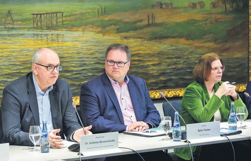 Ernste Lage, ernste Gesichter: Bürgermeister Andreas Bovenschulte, Finanzsenator Björn Fecker und Wirtschaftssenatorin Kristina Vogt (von links) stellten den Entwurf des Doppelhaushalts 2024/2025 vor.