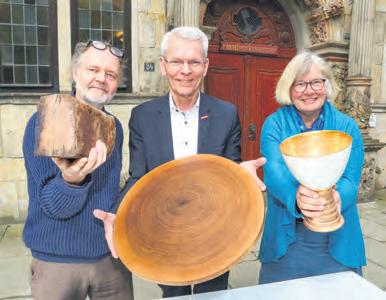 Peter Heidhoff präsentiert ein Holzbrot und HWK-Geschäftsführer Andreas Meyer erhofft sich, „dass wir durch diese Ausstellung Menschen fürs Handwerk gewinnen.“ Zwei brauchen sich nicht mehr begeistern zu lassen: Dörte Peyman und Gunda Schürmann sind mit selbstdesignten und gearbeiteten Schmuckstücken dabei. Gold und gewalztes Silber gehören zu ihren Materialien.