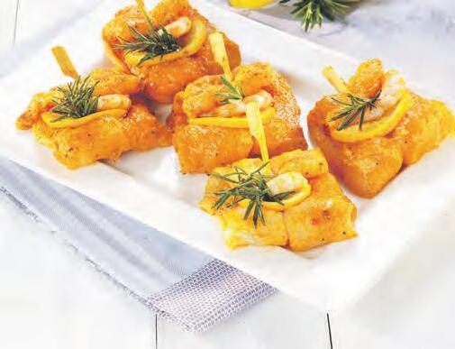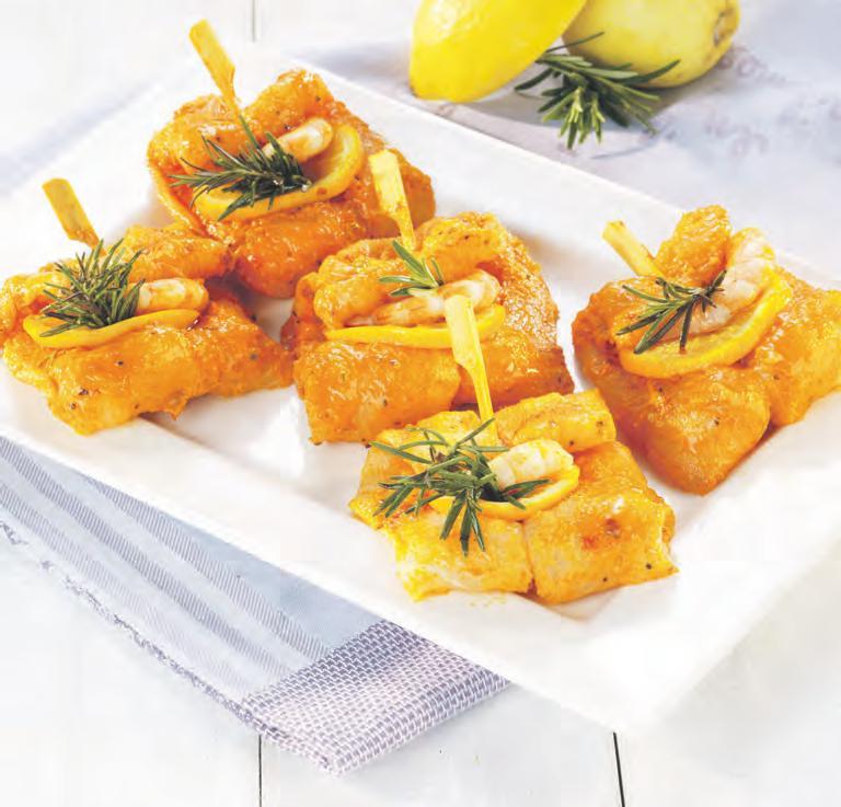 feines Pangasiusfilet, praktisch grätenfrei und ohne Haut, in einer pikanten Marinade mit einer Orangenscheibe und einer geschälten Garnele auf einem Spieß 1kg = 18,90 100g