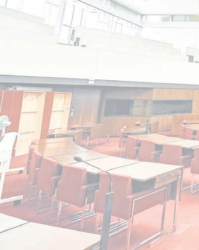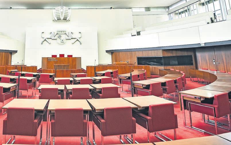 Im Plenarsaal der Bremischen Bürgerschaft sitzen die Abgeordneten der Fraktionen selbst. Im Hintergrund bauen viele davon auf