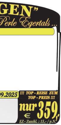 5 Tg. 05.10.-09.10./12.10.-16.10./19.10.-23.10. Fahrt ins Blaue-Überraschungsfahrt, Sektempfang, Rundfahrt mit Reiseleitung, 1 x Ka ee & Kuchen, Musik-und Tanzabend.........................................................................HP 555,-