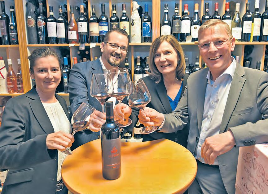 Bereits zur Hansezeit wurde Rotspon getrunken. Die norddeutschen Kaufleute brachten französischen Rotwein in die Hansestädte. Die Lagerung in Fässern brachte dem Wein dann seinen charakteristischen Geschmack, der ihn zum Rotspon machte. Jede Hansestadt hatte ihren Rotspon – nur Bremen nicht. Das Weinhaus Bultmann hat das nun geändert und 80 Prozent Merlot und 20 Prozent Cabernet Sauvignon in Barriquefässern reifen lassen. Darauf stoßen Wiebke Donandt (v.l.), Henrik Jacobs und Eva Jung erst einmal mit Bürgerschaftspräsident Frank Imhoff an. (kea)/Foto: Schlie