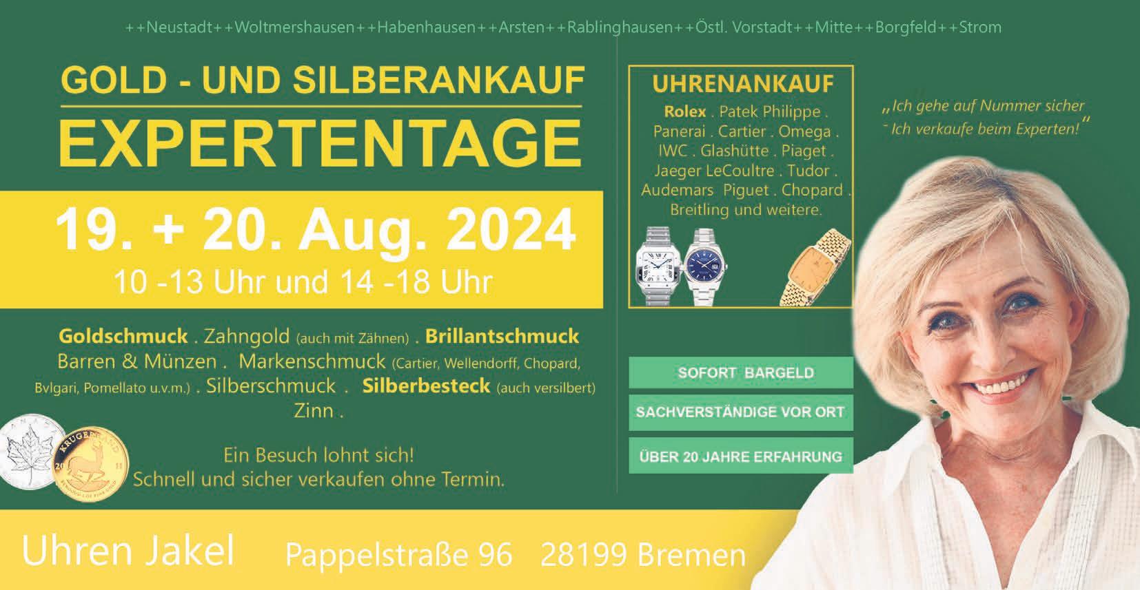 tentagen die Wertgegenstände und der Kunde kann sofort Bargeld in Empfang nehmen. Neben Altgold werden auch Brillantschmuck, Antikschmuck und Zahngold (auch mit Zähnen) angekauft. Hochwertige Uhren werden vor Ort geprüft und dem Kunden ein Angebot unterbreitet. So konnten die Expertentage schon viele Kunden begeistern - auch aus dem Bremer Umland, die aufgrund von Empfehlungen und der hohen Ankaufspreise das Fachgeschäft besuchen. Vorsicht ist bei fliegenden Händlern geboten, die nur für einige Tage oder Wochen leerstehende Ladengeschäfte anmieten und den Ankauf von Gold, Uhren und Pelzen zu überhöhten Preisen bewerben. Häufig handelt es sich um Lockangebote, die zu einem finanziellen Schaden der Kunden führen könnten. Hausbesuche solcher fliegenden Händler dienen häufig zu Vorbereitungen für andere Straftaten, wie z.B. Diebstähle oder Einbrüche.