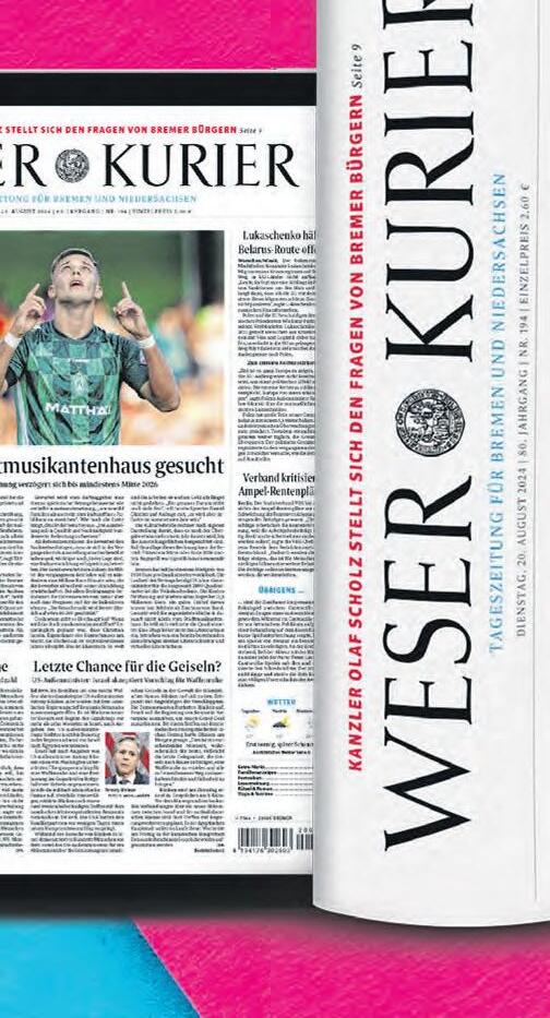 Gestaltete Anzeigen: Tel. 690 55 102 info@weserreport.de Zurzeit gelten Anzeigenpreisliste Nr. 51 vom 1. Januar 2024 und unsere darin abgedruckten AGB. Falls Sie dieses Produkt nicht mehr erhalten möchten, bitten wir Sie, einen Werbeverbotsaufkleber mit dem Zusatzhinweis „Keine kostewnlosen Zeitungen“ an Ihrem Briefkasten anzubringen. Weitere Informationen finden Sie auf dem Verbraucherportal www.werbung-im-briefkasten.de Internet: www.weserreport.de