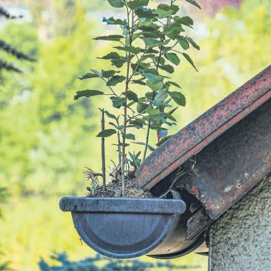 Über das Jahr hinweg sammelt sich im gesamten Dachentwässerungssystem so einiges an: Vogelnester, Blätter, Äste und anderer Schmutz. Zusätzlich spülen Regen und Unwetter Moos und Ablagerungen vom Dach in die Rinnen. Die Mischung setzt sich fest und verklebt durch den Einfluss der Elemente. Dadurch wird der Durchgang für Regenwasser immer schma ler, Wasser schießt über die Dachkante hinaus. Experten empfehlen daher, möglichst zweimal pro Jahr das Dachentwässerungssystem von Schmutz zu befreien. Hausbesitzer könnten dem Schmutz in den Dachrinnen zwar selbst zu Leibe rücken, doch die Arbeit auf einer Lei-