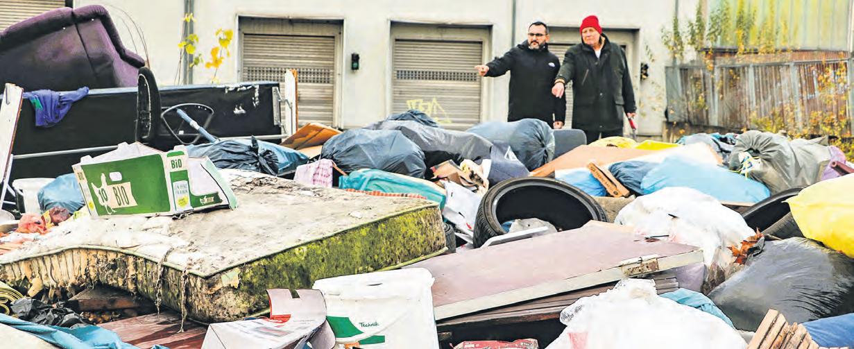 CDU-Kommunalpolitiker Yunas Kaya (l.) aus der Umweltdeputation zeigte sich bei einem Ortstermin mit besorgten Bürgern schockiert über die Massen an Abfällen und Sondermüll, die sich am Rande des früheren Könecke-Geländes in den vergangenen Monaten angesammelt haben.