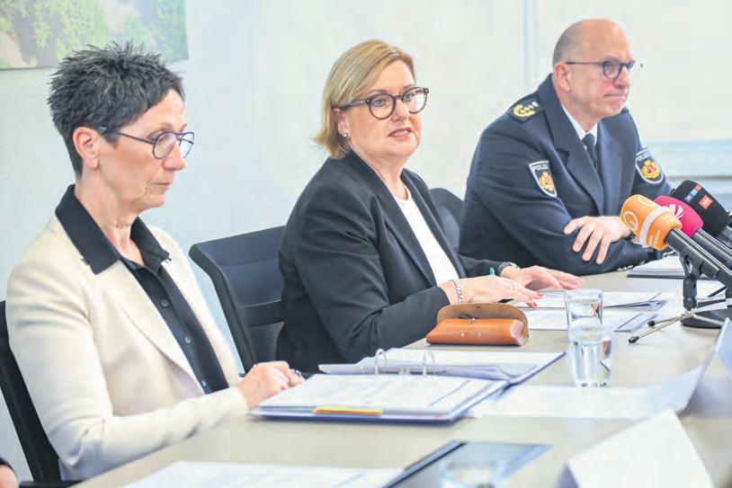 Zwischen weniger Diebstahl und mehr Gewalt: Innensenatorin Eva Högl (M.), die Leiterin des Kriminalamtes Petra van Anken (l.) und Polizeipräsident Dirk Fasse stellten die PKS 2025 vor. Foto: Schmidt
