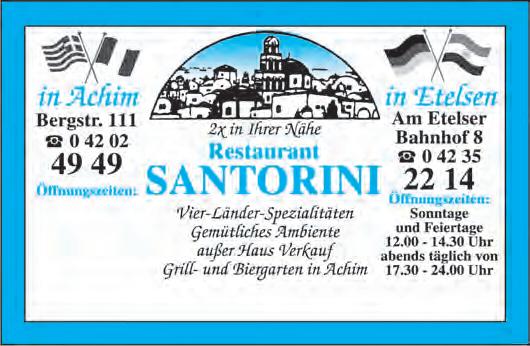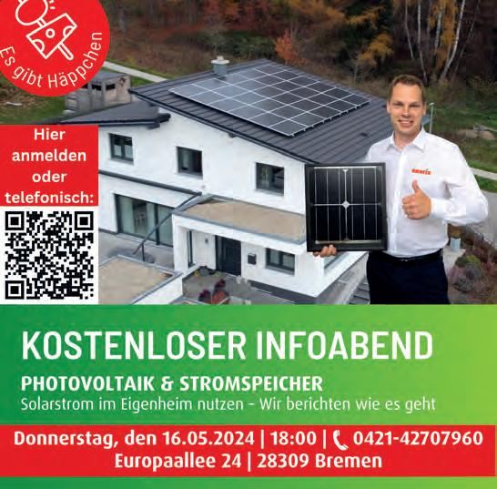 Sport: Lars Lenssen Kultur: Bettina Meister Das BLV: Regina Drieling, Nikolas Janßen, Antje Spitzner Büro Osterholz-Scharmbeck : Marius Roskamp Fotos: Klaus Werner Schlie Anzeigenleiter: Johannes Knees Kleinanzeigen: Tel. 690 55 400, Fax 690 55 500 Gestaltete Anzeigen: Tel. 690 55 102 info@weserreport.de Zurzeit gelten Anzeigenpreisliste Nr. 51 vom 1. Januar 2024 und unsere darin abgedruckten AGB. Falls Sie dieses Produkt nicht mehr erhalten möchten, bitten wir Sie, einen Werbeverbotsaufkleber mit dem Zusatzhinweis „Keine kostenlosen Zeitungen“ an Ihrem Briefkasten anzubringen. Weitere Informationen finden Sie auf dem Ver-braucherportal www.werbung-imbriefkasten.de Internet: www.weserreport.de Druck: DruckHaus Delmenhorst GmbH Verbreitete Auflage: 268.881 Exemplare mit DELME REPORT, HAMME REPORT und WÜMME REPORT 353.160 Exemplare