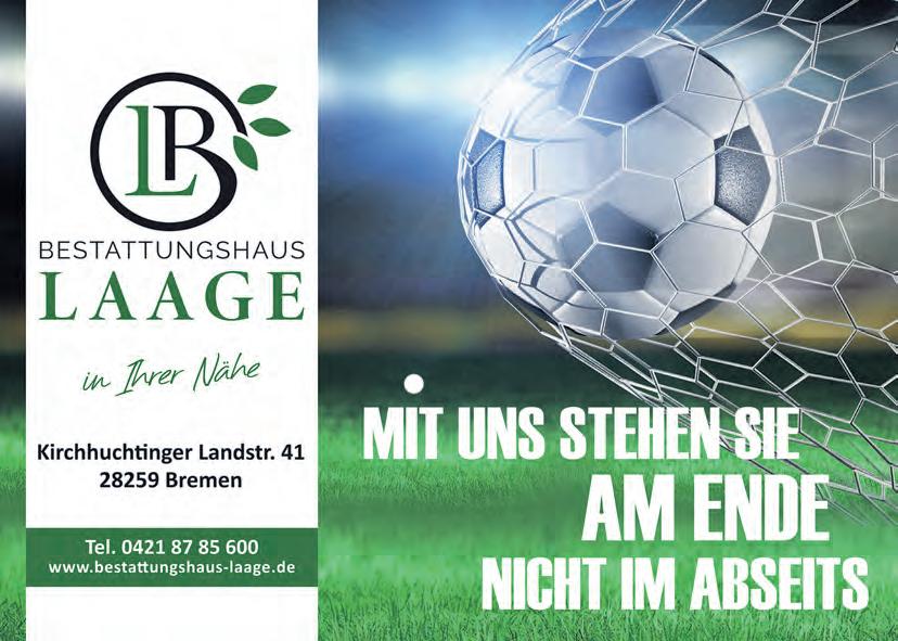 Marcus Schmidt Reise, Motor und Sonderthemen: Marinos Kaloglou Sport: Lars Lenssen Kultur: Bettina Meister Das BLV Regina Drieling, Nikolas Janßen, Antje Spitzner Büro Osterholz-Scharmbeck : Marius Roskamp Fotos: Klaus Werner Schlie Anzeigenleiter: Johannes Knees Kleinanzeigen: Tel. 690 55 400, Fax 690 55 500 Gestaltete Anzeigen: Tel. 690 55 102 info@weserreport.de Zurzeit gelten Anzeigenpreisliste Nr. 51 vom 1. Januar 2024 und unsere darin abgedruckten AGB. Falls Sie dieses Produkt nicht mehr erhalten möchten, bitten wir Sie, einen Werbeverbots-aufkleber mit dem Zusatzhinweis „Keine kostenlosen Zeitungen“ an Ihrem Briefkasten anzubringen. Weitere Informa-tionen finden Sie auf dem Verbraucherportal www.werbung-im-briefkasten.de Internet: www.weserreport.de Druck: DruckHaus Delmenhorst GmbH Verbreitete Auflage: 268.881 Exemplare mit DELME REPORT, HAMME REPORT und WÜMME REPORT 353.160 Exemplare