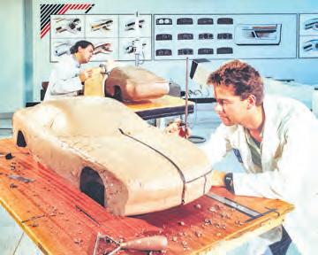 Links: Borgward-Konstrukteure begutachten ein lackiertes Modell im gleichen Maßstab. Im Modellierraum entstehen die 1:5-Plastilin-Modelle (Foto unten).