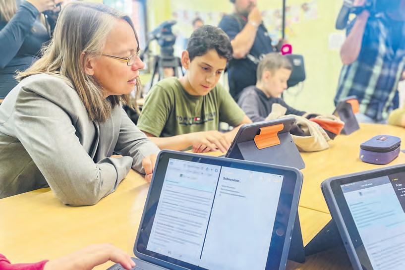 Bildungssenatorin Sascha Karolin Aulepp erprobte den KI-Chatbot Telli gemeinsam mit Schülern und Schülerinnen der Oberschule Habenhausen in der Praxis.