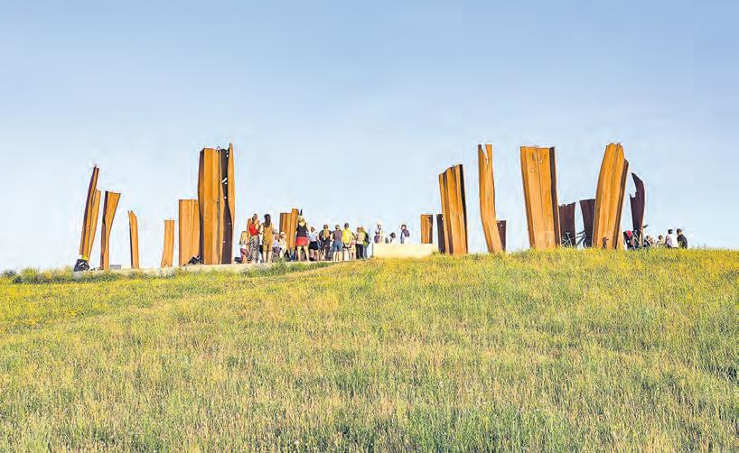 machen. Dort angekommen gibt es wieder eine gute Ausstattung am Imbiss, eine Toilette und vor allem einen Badestopp, um sich wieder abzukühlen, denn uns steht nach der Wanderung durchs flache Land noch ein Aufstieg auf den höchsten Berg Bremens bevor. Metalhenge, welches vom Feldmarksee in rund 30 Minuten zu Fuß zu erreichen ist, wurde 2021 von dem Künstler und Schauspieler Thomas Roth in Kooperation mit der Bremer Stadtreinigung geplant und errichtet. Von dort haben wir eine Aussicht über Bremen, die es sonst so nicht gibt: Während sich gen Norden der Blick übers Blockland bietet, erstreckt sich im Süden die Stadt: das Weserstadion, der Dom und die In-