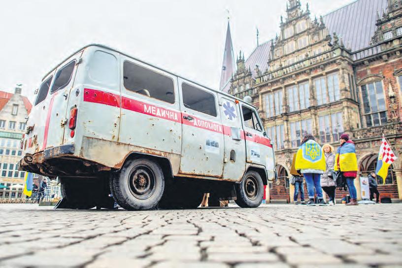 „Ein zerschossener ukrainischer Rettungswagen steht auf dem Marktplatz vor der Bürgerschaft und dem historischen Rathaus“, so beschreibt Hauke-Christian Dittrich sein Foto. Der Oldenburger ist Gewinner in der Sparte Pressefoto beim Bremer Fotopreis 2024: „Das Fahrzeug stammt aus dem Ort Derhatschi in der ukrainischen Region Charkiw und wird derzeit in zahlreichen deutschen Städten als Mahnmal russischer Kriegsverbrechen gezeigt.“ Regine Suling-Williges, Vorsitzende des Veranstalters Deutscher Journalisten-Verband Bremen fragt: „Heute kann doch jeder fotografieren, oder? Ein Schnappschuss mit dem Smartphone – und fertig ist das Bild.“ Die Antwort liefert sie gleich mit: „So einfach ist es nicht.“