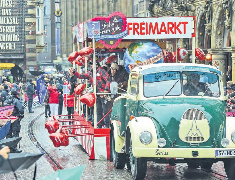 Zur Halbzeit der fünften Bremer Jahreszeit zieht an diesem Samstag der Freimarktsumzug durch die Innenstadt. Rund 125 Festwagen und Fußgruppen präsentieren ihre Kreativität, Akrobatik und bunte Kostüme sowie Dekorationen.