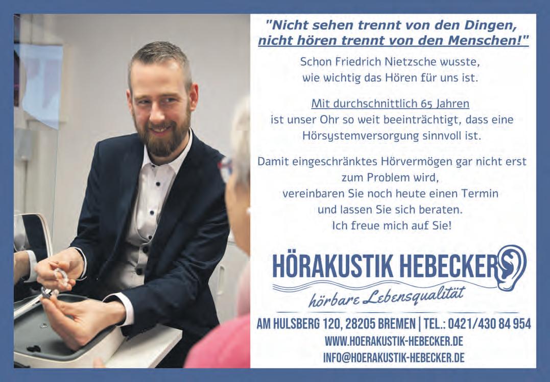 lass zu nehmen, um das eigene Gehör einmal genauer unter die Lupe zu nehmen. Denn wer gut hört, bleibt aktiv, sozial eingebunden und geistig fit. Ein kostenloser Hörtest beim Hörakustiker kann schnell Gewissheit bringen. Mehr verstehen bedeutet mehr erleben – also am besten gleich einen Termin vereinbaren.