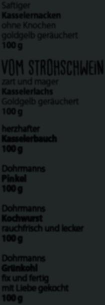 Bandnudeln mit Basilikum-Rucola-Pesto und einem Hauch Knoblauch Portion 7,30 € Kleine Nürnberger Rostbratwürstchen mit Bayrisch Kraut und hausgemachtem Kartoffelstampf Portion 7,30 € Alles für den Grünkohl! VeggyLust FREITAG Buntes Fischfrikassee mit gebuttertem Reis Portion 7,90 € Hausgemachte Semmelknödel in leckerer Schwammerlsauce Portion 7,30 € Gebratene Leber „Berliner Art“ überzogen mit glasierten Zwiebeln und Äpfeln, dazu Butterbohnen und frisches Kartoffelpüree Portion 7,30 € SAMSTAG Erbsensuppe mit Suppengrün und Karotten, Fleischeinlage und Kartoffeln Portion 4,80 € SONNTAG Dohrmanns Grünkohlplatte lecker und herzhaft mit Pinkel, Kochwurst, Kasseler und Bauchspeck, dazu Salzkartoffeln Portion 8,90 € VeggyLust VeggyLust VeggyLust VeggyLust WEIDEOCHSEN WOCHEN VOM 02. - 12.11.22 Die besten Tiere werden für uns direkt auf den Weiden unserer Erzeugerhöfe ausgewählt! SAVETHEDATE