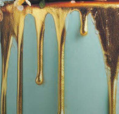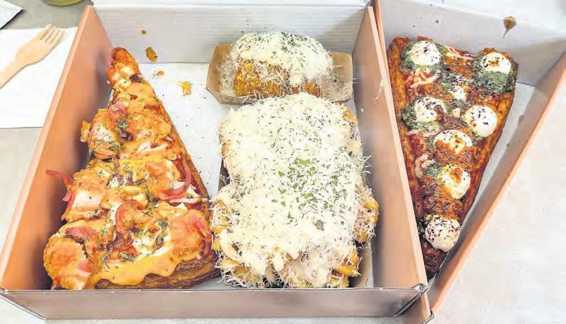 nü-Angebot wäre somit eine Ersparnis von 2,60 Euro gegenüber den Einzelpreisen. Dazu bestellen wir noch ein einzelnes Slice, das Mozzarella Mediterrana, für 9,90 Euro. Insgesamt sind beide „Schnitten“ ganz schön mächtig. Sie bestehen aus Blätterteig, der nicht so zartfedrig ist, wie man ihn von Croissants kennt. Tatsächlich ist der dreieckige, knusprige Teigling sehr hoch, dick und kompakt. Als „Boden“ schmeckt er gut und ist auch nicht so fettig wie befürchtet. Getoppt wird er einmal mit einer Mischung aus Cashew-Kernen, eingelegten roten Zwiebeln und in knuspriger Panade ausgebackenen Chicken-Bites mit pikanter Sriracha-Mayo. Auf dem anderen Slice befinden sich MozzarellaKugeln, Tomatensoße und Pes-