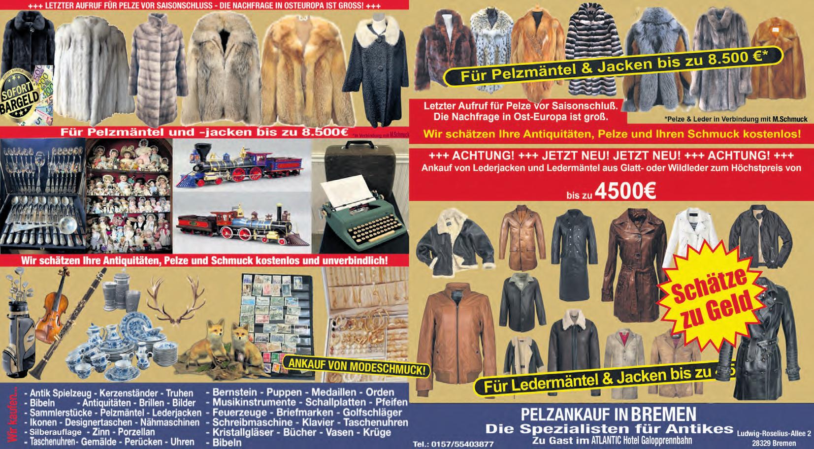 Achtung aufgepasst! Wandeln Sie Ihre Wertsachen in Bargeld um - Nutzen Sie die Chance Ihre Wertgegenstände, die Sie nicht mehr in Gebrauch nehmen, wie z.B. Pelze zu Höchstpreisen zu verk.- zahle 100-5000 € - antike Möbel, Nähmaschinen, alte Musikinstrumente, Puppen, Ölgemälde, Teppiche, Porzellan, asiatische Kunst und alte Bronzefiguren, jegliche Art von Goldschmuck, Bernstein, Marken-Uhren und Tafelsilber. Wir machen Ihnen ein gutes Angebot mit seriöser Abwicklung. Profitieren Sie von unserer jahrelangen Erfahrung. Fa. Klimkeit 0471-30940881