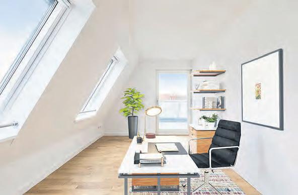 zentration. Große, am besten mehrere Fensterflächen lassen Licht in den Raum, vorsorglich sollte ein Sonnenschutz mitgedacht werden. Der wiederkehrende Blick ins Grüne tut Kopf und Seele gut. Steht der Schreibtisch seitlich zum Fen-