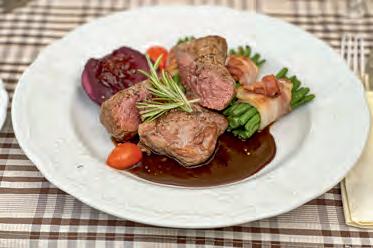 miteinanderaufkochen, Fondsüber dieBirnengießen undeinen Tagim Kühlschrankziehen lassen.FürdieSoßeÖlineinem Topf erhitzen, Knochenund Beinfleischdarinscharfanrösten,Gemüsehinzufügen,ebenfalls anrösten, Tomatenmark zufügen,leichtanrösten,dannnach undnachmit Rotweinablöschenundeinkochenlassen.Gewürze hinzufügen,Brüheaufgießenundmindestens zweiStunden beimittlererHitze köchelnlassen,bissichdasFleischleicht vom Knochenablösenlässt. Passieren,mitSalzund Pfefferabschmeckenundbis zur gewünschten Konsistenzeinreduzieren.Nun dieBohnenin kochendemSalzwasser kurzblanchieren,abkühlenlassen,inBaconeinwickelnundinRapsöl kurzinder Pfanne anbraten. Rehsteakssalzenund pfeffern, kurzinder Pfanne scharfanbraten,in vorgeheiztemOfenbei185GradUmluft ca 7–8Minutenziehenlassen.Steakaufschneidenundmitden weiterenZutatendekorativaufeinem Telleranrichten.