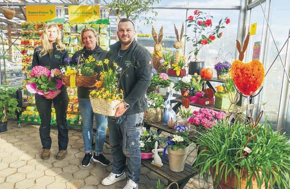 Mit vielfältig bunter Blumenpracht startet die Gärtnerei Irmler in Hoope in den Frühling: Lena Koppenhagen, Katja Ehlers und Inhaber Sebastian Irmler (von links).