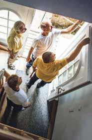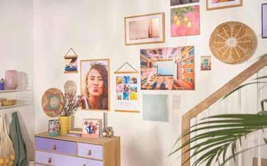 kleineren Nature Prints etwa von Cewe. So fühlt sich das Zuhause ganzjährig wie Urlaub an. Wie lässt sich eine Vielzahl unterschiedlicher Fotos so gestalten, dass sich ein stimmiges Gesamtbild ergibt? Hier gibt es verschiedene Möglichkeiten – aufgeräumt oder zufällig. Wer zum Beispiel Familienfotos an die Wand des Treppenaufgangs wohl sortiert hängen möchten, nutzt die sogenannte Kantenhängung und kann das Treppengeländer als optische Orientierungslinie nutzen. Dabei jeweils die unteren Ränder der Bilder an der Steigung des Handlaufs ausrichten. Mit Hilfe von Wasserwaage und Abdeckband gibt es ein aufgeräumtes Ergebnis. Für die sogenannte Petersburger Hängung bestehen keine strikten Regeln. Ein großes Foto wird beispielsweise als zentrales Element