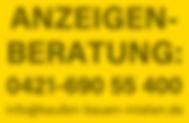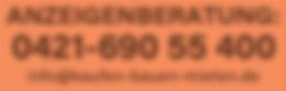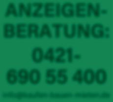 Ihre Anzeigen können Sie bequem per E-Mail: info@kaufen-bauen-mieten.de, telefonisch unter 0421- 690 55 400