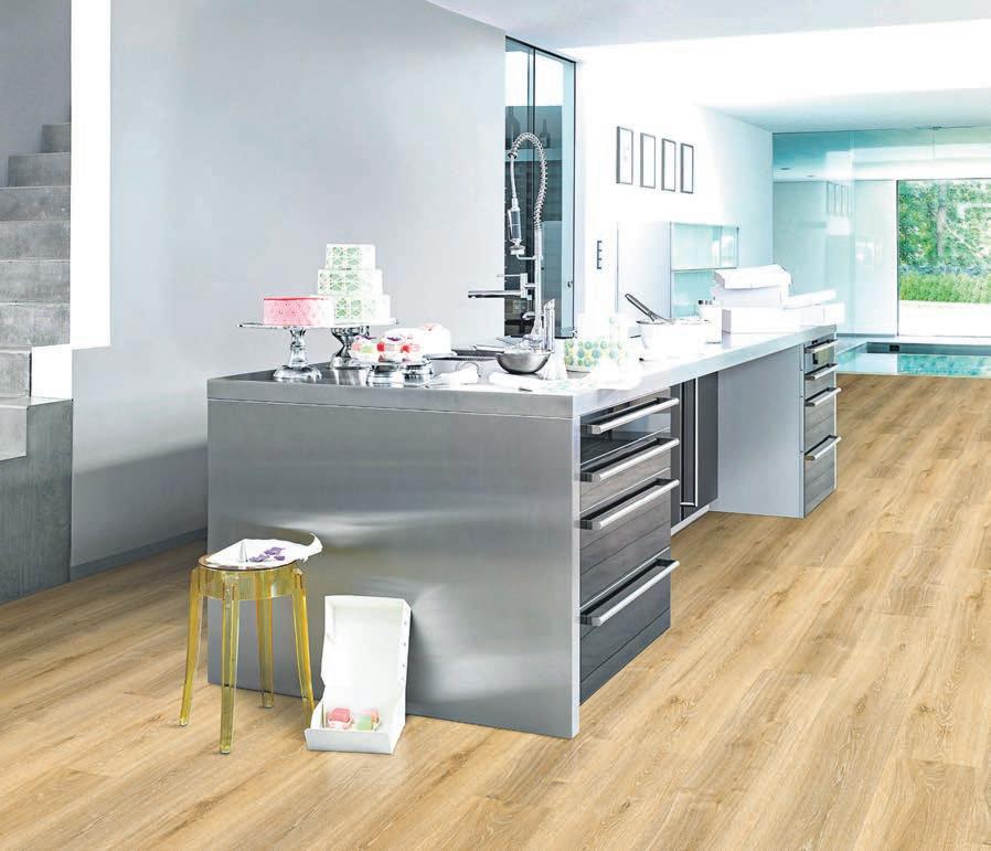 Die integrierte und besonders feste Trägerplatte gleicht leichte Unebenheiten im Untergrund aus und sorgt so für mehr Stabilität, ein angenehmes Laufgefühl und gute Raumakustik. Übergekochtes Nudelwasser, Fettspritzer aus der Bratpfanne und andere Missgeschicke können dem dimensionsstabilen Fußboden nichts anhaben, denn er ist zu 100 Prozent wasserfest und daher leicht zu reinigen. Bewährte Klick-Mechanik sorgt für die einfache Verlegung.
