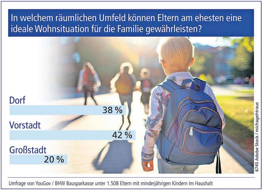 Eine ideale Wohnsituation für ihre Kinder erwartet eine knappe Mehrheit der Eltern insgesamt am ehesten in der Vorstadt. 42 Prozent sind der Meinung, hier das Beste aus beiden Welten zu finden. 38 Prozent sehen