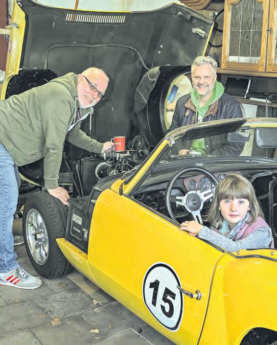 Fachsimpeln an der Motorhaube mit interessiertem Nachwuchs: Der Motor des Triumph Spitfire 1, Baujahr 1963, will gepflegt werden.