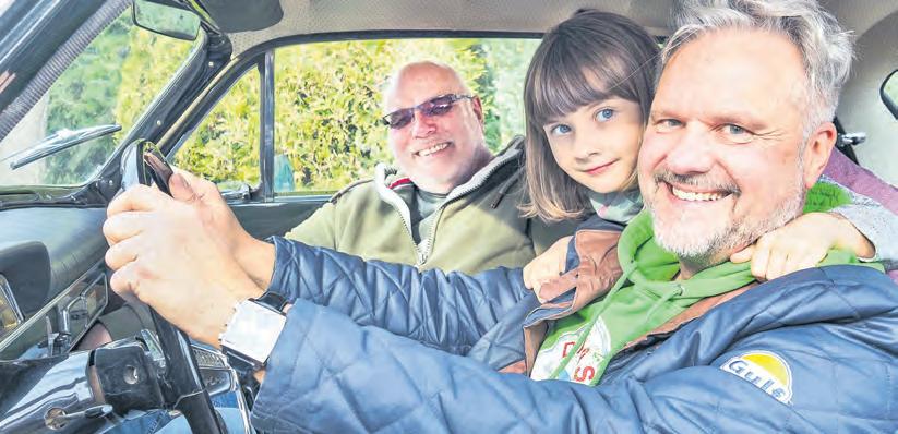 Startklar für die 22. Oldtimer Klassik (v.r.): Organisator Dirk Grundmann mit Tochter Soé und Wolfgang Niemeier, der mit seiner himmelblauen Volvo Amazone Kombi zum ersten Mal teilnimmt. Fotos: Konczak