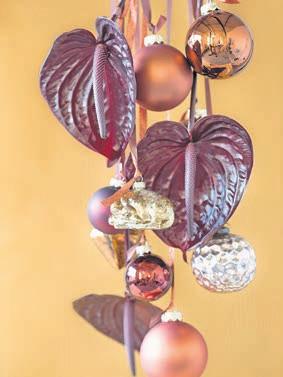 Mit wenigen Anthurienblüten und darauf farblich abgestimmtem Christbaumschmuck lässt sich eine Art Weihnachtsmobile basteln. Foto: Anthuriuminfo