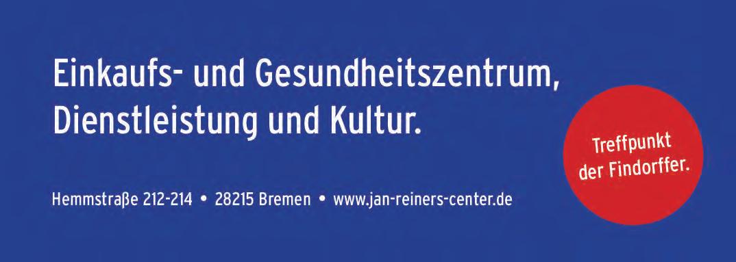 Das Jan-Reiners-Center ist klein aber oho Mitten in Findorff gelegen ist das JanReiners-Center das Nachbarschafts-Einkaufszentrum vor Ort und bietet alles unter einem Dach, was für den täglichen Bedarf benötigt wird – und noch so einiges mehr. „Hier können Sie einkaufen, genießen, Ihre Erledigungen machen, sich eine kleine Pause gönnen, während sich unsere Dienstleister und niedergelassenen Ärztinnen und Ärzte liebevoll um Ihr Wohlergehen kümmern“, wissen die Findorffer. Das Erfolgrezept: Das Jan-Reiners-Center bietet kurze Wege, Freundlichkeit und Nähe zu seinen Kunden. Und das beginnt beim Einkaufen (Bäckerei Rolf, REWE, Rossmann) und geht weiter bei den Dienstleistern wie etwa der Jan-ReinersApotheke, Ryf mein Friseur und dem Reinigungsund Bügelservice. Einfach nur genießen? Auch das geht hier mit Kaya´s Hähnchengrill oder bei Kitchens of India. Von Dienstag bis Freitags ist