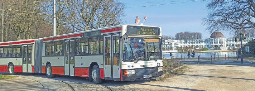 kehr (ÖPNV) allen Bewohnern und Bewohnerinnen der Stadt barrierefrei zur Verfügung zu stellen“, weiß Borcherding. Es gab noch keine Fahrzeuge dafür zu kaufen. Nur die Firma Gottlob Auwärter in Bayern wagte sich an die Neukonstruktion. Die BSAG bestellte dann als erster Verkehrsbetrieb zum Herbst 1988 35 der Gelenkbusse vom Typ N 4021. Am 8. Oktober rollten die ersten durch die Hansestadt. Seitdem verfügen alle BSAGNiederflur-Busse auch über einen Hublift für Rollstühle. „Das Depot“ an der Schlossparkstraße 45 in Sebaldsbrück zeigt den glänzenden Oldie. Weitere Informationen: fdbs.net