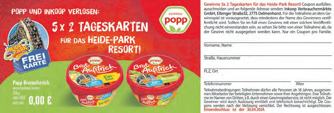 Gewinne 5x 2 Tageskarten für das HeidePark Resort! Coupon ausfüllen, ausschneiden und an folgende Adresse senden: lnkoop Verbrauchermärkte GmbH, Elbinger Straße 32, 2775 Delmenhorst. Für die Teilnahme an dem Gewinnspiel ist vorausgesetzt, dass mindestens der Name des Gewinners veröffentlicht wird. Sollten Sie im Fall eines Gewinns mit einer solchen Veröffentlichung nicht einverstanden sein, so sehen Sie bitte von einer Teilnahme ab, da der Gewinn nicht ausgegeben werden kann. Nur ein Coupon pro Familie.