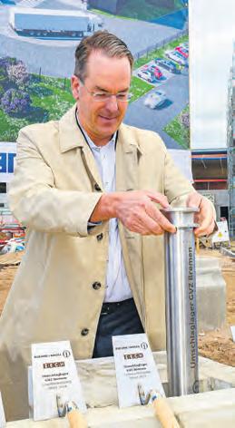 Tobias Jerschke und Gäste füllten ein Metallrohr mit einem Grundriss, einer Firmenzeitung von 1965, einer gewöhnlichen Zeitung, Fotos der Teamleitung, Münzgeld, einer Darstellung des Neubaus und einem Modelllaster des zukünftigen Hausherren Kühne und Nagel: Bei der Grundsteinlegung fürs Umschlaglager des Logistikdienstleisters versenkte sein Vorsitzender eine Zeitkapsel.