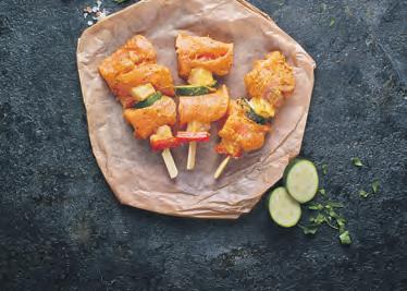 Lachsspieß „Hawaii“ saftige Lachsfiletstücke, praktisch grätenfrei ohne Haut, mit Ananas, Zucchini und roter Paprika, mit rotem Curry mariniert, auf einem Spieß 1kg = 26,90 100g
