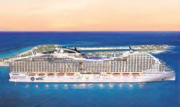Der Steckbrief der MSC World America (Indienststellung: April 2025) kann sich sehen lassen: 22 Decks, 47 Meter breit, 2.614 Kabinen, 13 Restaurants, sechs Pools und 14 Whirlpools. Neu ist The Harbor, ein OutdoorAreal speziell für Kinder und Familien mit Aqua-Park, Hochseilgarten und Zip-Line. Ein architektonisches Meisterwerk ist der Jaw Drop – laut MSC eine der längsten Trockenrutschen auf See. Dieser führt die Gäste durch das Maul eines Hais spiralförmig elf Decks tief auf die World Promenade. Wem das noch „harmlos“ erscheint, sollte den Cliffhanger probieren –eine Überwasser-Schaukel etwa 50 Meter über dem Meer.