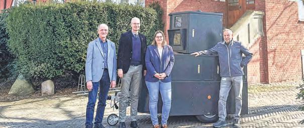 Volker Töllner (Fachdienstleitung Bürgerservice und Straßenverkehr), Erster Kreisrat Jens-Hermann Kleine und Silke Bodenstab (Teamleitung Ordnungswidrigkeiten) nahmen die zweite semistationäre Messanlage von Michael Gewohn (Jenoptik AG) (v. l.) in Empfang. Foto: Lk