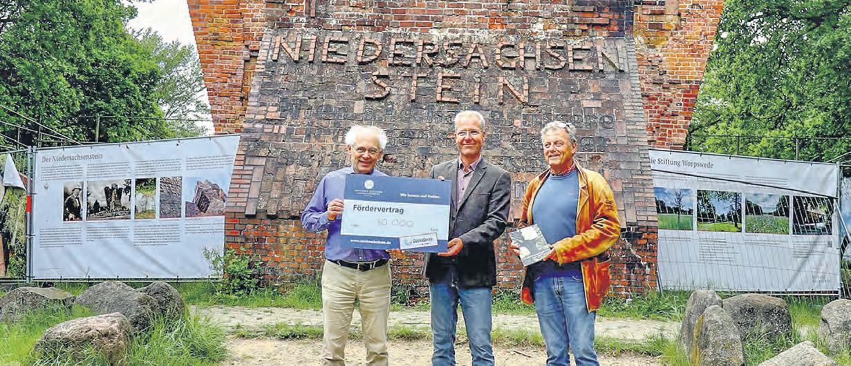 Sanierung des Bernhard Hoetger Bauwerks dabei. Wolfram Seibert ist Leiter des Ortskuratoriums Bremen der Stiftung. Er überbrachte den symbolischen Fördervertrag persönlich nach Worpswede. Möglich wurde die Förderung dank zahlreicher Spenden sowie aus Erträgen der Lotterie Glücksspirale. Der Niedersachsenstein gehört nunmehr zu den über 520 Objekten, die die private DSD allein in Niedersachsen fördern konnte. Sobald eine Zusage aus Berlin vorliegt, will die Stiftung mit der umfangreichen Sanierung starten und hoffentlich im September 2025 mit einem großen Fest die Fertigstellung der Baumaßnahmen feiern.