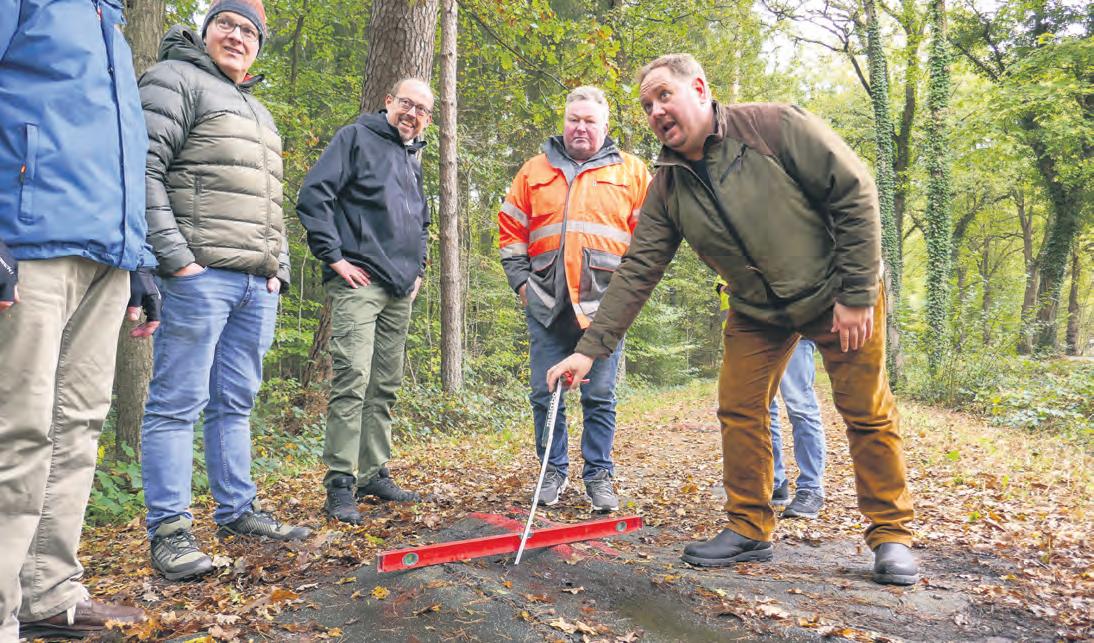 An der Abzweigung Forstweg stoppten die Radler und begutachteten dort eine Teilstrecke mit besonders starken Beeinträchtigungen durch Unebenheiten und Risse im Belag. Zudem waren dort gefährlich tiefe Randstreifen vorhanden. Fischer prüfte mit Wasserwaage und Zollstock die Höhe der Schäden, die um 5 bis 10 Zentimeter lag. Zwischenzeitlich waren manche Gefahrenstellen mit roter Farbe markiert.