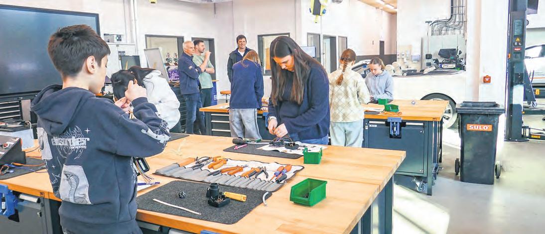woche ein Baustein sei, dem Fachkräftemangel in Handwerk und Industrie entgegenzuwirken. Dort lernten die Schulkinder typische Arbeiten in den jeweiligen Handwerksberufen kennen und probierten einiges selber aus. Beim Besuch der Projektwoche mit Schülerinnen und Schülern in der Kfz-Werkstatt an der Hauptstelle der BBS waren die Achtklässler emsig mit der Montage einer Prüfbox für die Anhängersteckdose beschäftigt. Dabei standen ihnen die Fachpraxislehrer zur Seite. Fachpraxislehrer Michael von Düllen erklärte, dass diese