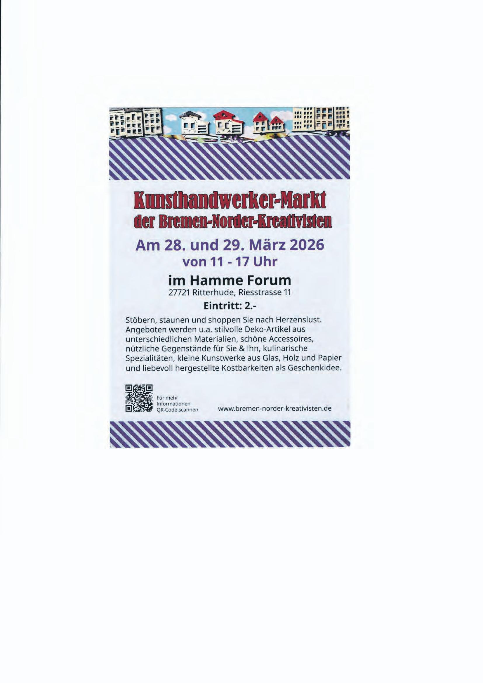 RITTERHUDE – Kunsthandwerk, Handwerksvorführungen und individuelle Geschenke – all das bietet der Frühlingsmarkt der Bremen-Norder-Kreativisten im Hamme Forum, Riesstraße 11, am kommenden Wochenende. Am Samstag, 28. März, und Sonntag, 29. März, öffnet der Markt jeweils von 11 bis 17 Uhr, der Eintritt kostet 2 Euro.