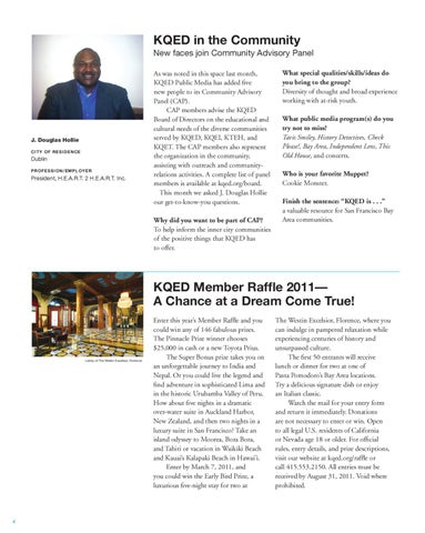 As was noted in this space last month, KQED Public Media has added five new people to its Community Advisory Panel (CAP). CAP members advise the KQED Board of Directors on the educational and cultural needs of the diverse communities served by KQED, KQEI, KTEH, and KQET. The CAP members also represent the organization in the community, assisting with outreach and communityrelations activities. A complete list of panel members is available at kqed.org/board. This month we asked J. Douglas Hollie our get-to-know-you questions. Why did you want to be part of CAP? To help inform the inner city communities of the positive things that KQED has to offer.