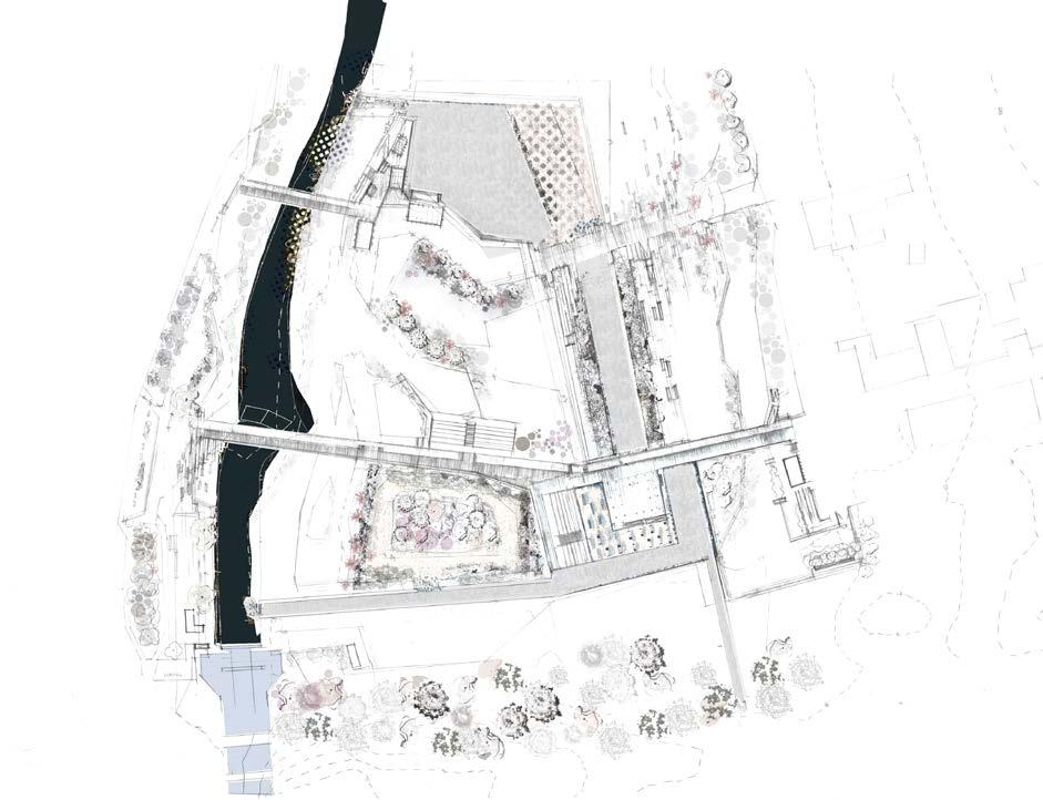 Sections through river system, showing the water flow from original river to rehabilitation wetland systems, flowing back to the Liesbeek river. The wetland systems slow down the flow of the water, which allows for effective filtration to occur by sustaining the emergent vegetation present on site (i.e. Typha reeds) as well as introducing more bulbous plants for excess nutrient absorption.