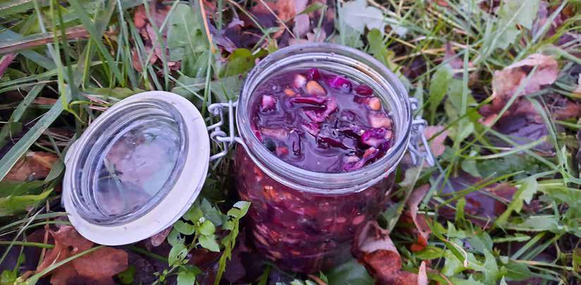 • Doe het rodekoolmengsel in een steriele weckpot. Maak een pekelwater, door 2 gram zout op te lossen in 100 ml water. Voeg zoveel water toe tot het rodekool mengsel helemaal onder staat. Dek de kool af met een steriele steen (of een kleinere jampot die in de weckpot past). Zorg ervoor dat er geen luchtbelletjes in de vloeistof zitten.