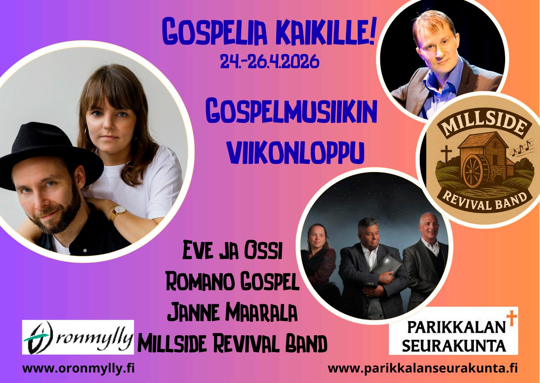 24.–26.4. OroSoi – Gospel-festivaali, Pianokonsertti Janne Maarala Virsistä inspiroiden Finlandiaan, Eve ja Ossi (varmistusta odotetaan), Romano Gospel, OroGospel, Vesa Honkanen