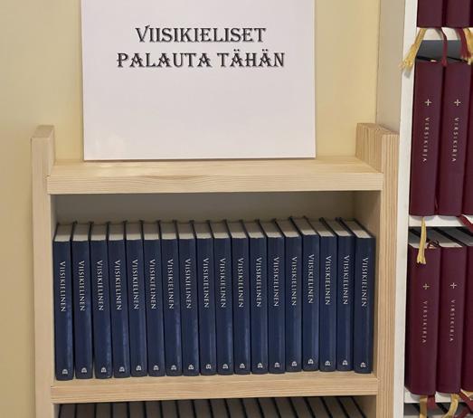 Viime vuonna Vivamo sai vastaanottaa yksityisiltä lahjoittajilta uudet virsikirjat ja viisikieliset. Uudet kirjat tarvitsevat tietysti arvoisensa puitteet, uudet hyllyköt. Taas oli kutsuttava vapaaehtoinen apuun, ja niin ilmestyivät uudet hyllyköt ruokasalin flyygelin viereen ja kirkon eteiseen.